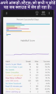 यह ऐप आपकी आत्म-सुधार की यात्रा को एक रोमांचक खेल में बदल देता है, जहाँ आप अपनी दैनिक 'लकीर' को बढ़ाकर खुद से प्रतिस्पर्धा करते हैं। बस अपनी आदत निर्धारित करें, अपनी प्रगति दर्ज करें, और अपनी सफलता की लकीरों को बढ़ते हुए देखें। **Habitbull** आपको लगातार प्रेरित रखने के लिए केवल हाँ/नहीं या संख्यात्मक लक्ष्यों को ही नहीं, बल्कि प्रेरणादायक उद्धरणों और छवियों को भी एकीकृत करता है। टैबलेट से लेकर फोन तक, यह आपकी प्रगति को कई डिवाइसों पर सिंक करता है और क्लाउड बैकअप के साथ आपके डेटा को सुरक्षित रखता है। होम स्क्रीन विजेट और गूगल फिट एकीकरण जैसी सुविधाओं के साथ, अपनी आदतों को ट्रैक करना कभी इतना सुविधाजनक नहीं रहा।
