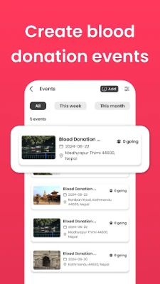 Hamro Blood Bank सिर्फ रक्त ढूंढने या दान करने तक ही सीमित नहीं है; यह सामुदायिक भागीदारी को भी बढ़ावा देता है। ऐप के माध्यम से अपने क्षेत्र में आगामी रक्त दान शिविरों का पता लगाएं और उनमें भाग लें, या स्वयं ऐसे कार्यक्रमों का आयोजन करके दूसरों को प्रेरित करें। वास्तविक समय की सूचनाओं के साथ हमेशा अपडेट रहें – चाहे वह मिलान करने वाले दाता हों, नए इवेंट हों, या आपके आस-पास रक्त की कोई तत्काल आवश्यकता हो। Hamro Blood Bank के साथ, आप एक ऐसे आंदोलन का हिस्सा बनते हैं जो सामूहिक प्रयास से जीवन बचाता है।