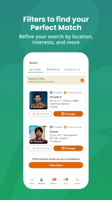 आप केरल माट्रीमनी पर अपना प्रोफ़ाइल निःशुल्क बना सकते हैं और अनगिनत संभावनाओं को खोज सकते हैं। हमारी शक्तिशाली MIMA™ नामक AI-संचालित मिलान प्रणाली आपकी प्राथमिकताओं के आधार पर सर्वोत्तम संगत मिलानों की पहचान करती है। जब भी कोई नया मैच मिलता है, या कोई आपके प्रोफ़ाइल में रुचि दिखाता है, तो आपको तुरंत सूचनाएँ प्राप्त होती हैं। हमारे उन्नत फ़िल्टर विकल्प आपको शहर, शिक्षा, व्यवसाय या स्थान जैसी विभिन्न श्रेणियों के अनुसार अपनी पसंद के साथी की तलाश करने की सुविधा देते हैं, जिससे आपकी खोज और भी सटीक हो जाती है।