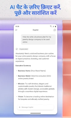 'काम के लिए Copilot' सिर्फ एक AI से कहीं बढ़कर है; यह आपके परिचित Microsoft 365 ऐप्स का एक शक्तिशाली एकीकरण है। अपने AI सहायक Copilot के साथ मिलकर, आप Word में पेशेवर रिज्यूमे या रिपोर्ट तैयार कर सकते हैं, Excel में स्प्रेडशीट टेम्पलेट्स के साथ अपने बजट को कुशलता से प्रबंधित कर सकते हैं, और PowerPoint में Presenter Coach के साथ अपनी प्रस्तुतियों को निखार सकते हैं। इसके अतिरिक्त, Microsoft Designer की AI-पावर्ड क्षमताओं के साथ सेकंडों में आकर्षक डिज़ाइन बना सकते हैं और तस्वीरों को संपादित कर सकते हैं। यह ध्यान रखना महत्वपूर्ण है कि Microsoft Designer की प्रीमियम सुविधाएँ व्यक्तिगत Microsoft 365 Personal और Family सदस्यता के साथ उपलब्ध हैं।